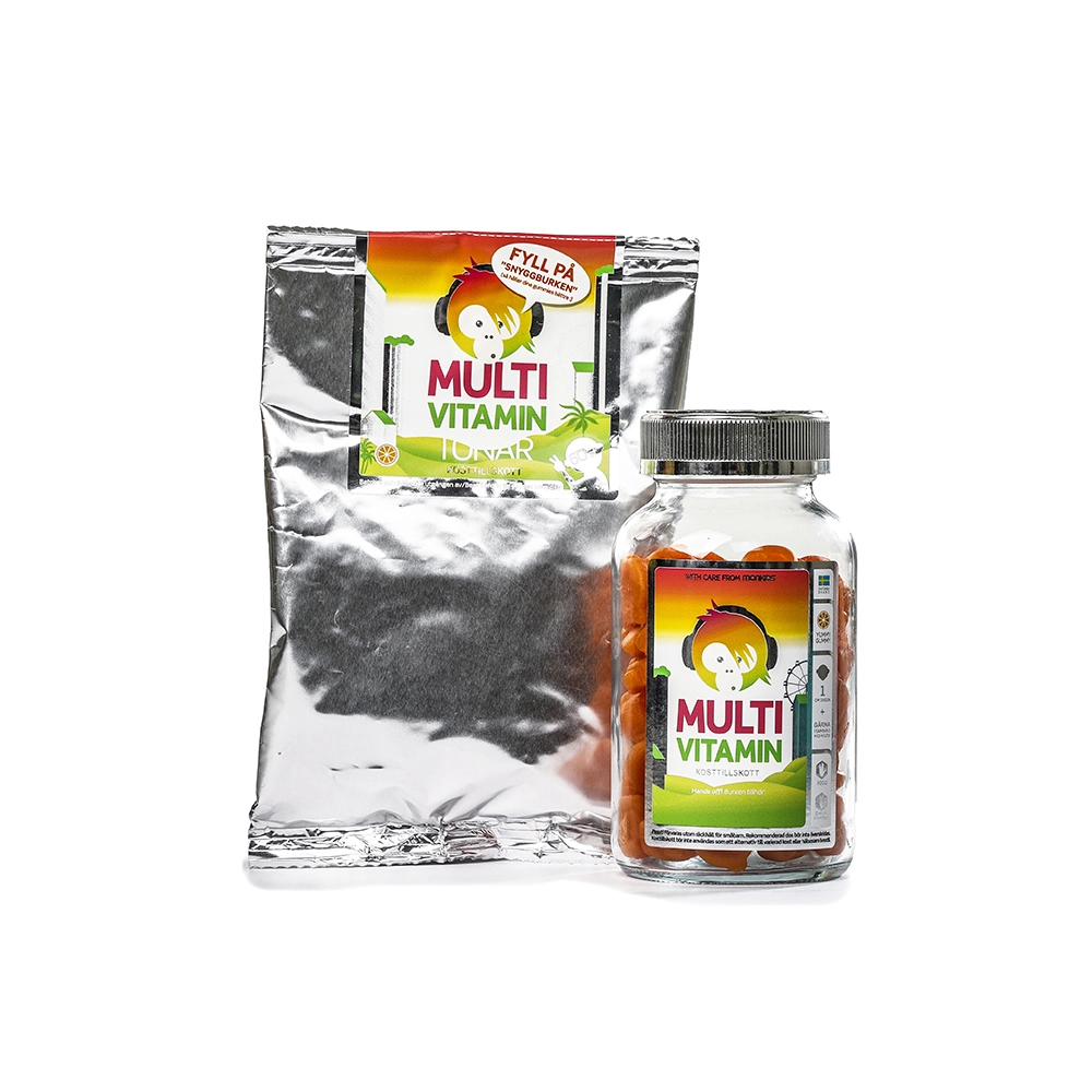 Monkids multivitamin apelsin tonår är en god vitamingummy med naturlig smak av apelsin. Den veganska gummyn innehåller 10 vitaminer och 2 mineraler – däribland Vitamin D, Vitamin B12, jod, folsyra, Vitamin E, biotin, Vitamin A och selen. Multivitaminen är anpassad för tonåringars behov och rekommenderas från 12 år. Kan även ätas av vuxna.