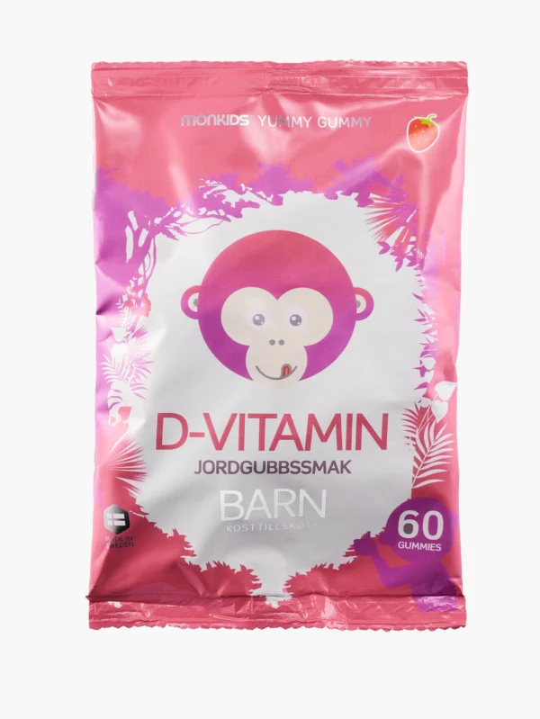 Vill du ge ditt barn extra D-vitamin under vinterhalvåret? Äter ditt barn inte fisk? Säg hej till nya Monkids D-vitamin Jordgubb! En mjuk, god och svensktillverkad gummy full med D-vitamin. En om dagen räcker för att säkerställa hela dagsbehovet av D-vitamin. Produkten är vegansk och har naturlig jordgubbssmak. Den fina fägen kommer från blåbär och morot. Passar hela familjen.