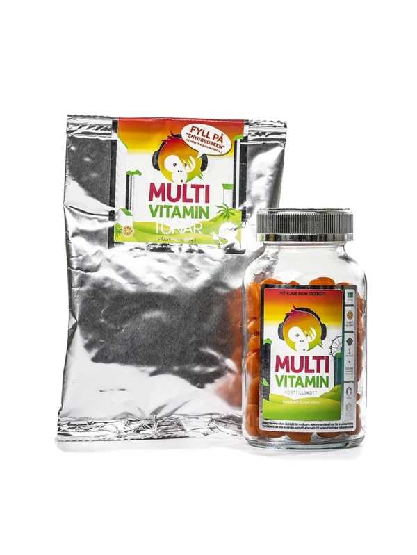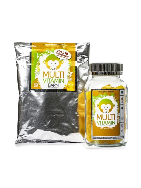 Petar ditt barn i maten i perioder? Eller vill du se till att barnet får i sig ett jämnt intag av alla viktiga vitaminer? Då ska du kolla in Monkids klassiska storsäljare! En god, lättuggad multivitamin med 10 vitaminer, bl.a. B12, folsyra, E-vitamin och hela dagsdosen av D-vitamin. Gummyn har naturlig hallonsmak och är en favorit hos många barn. Från 3 år. 60 gummies/refillpåse.